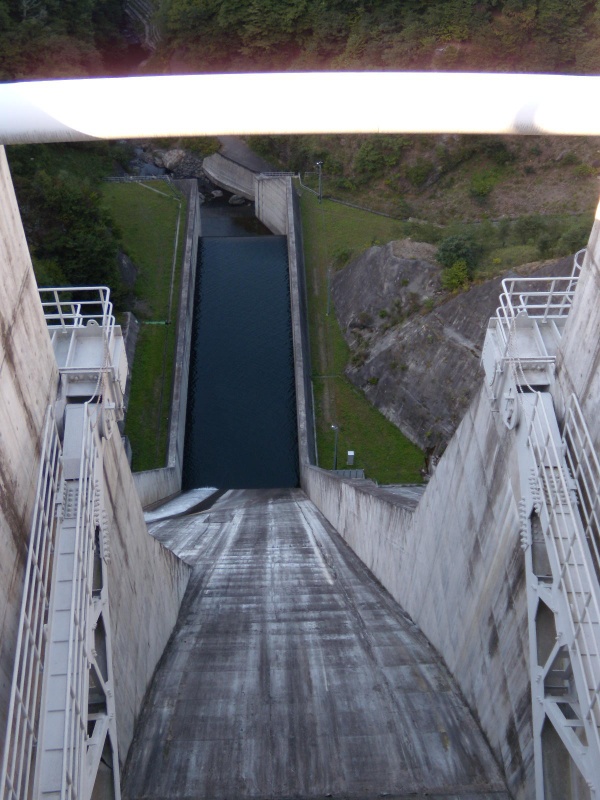 洪水吐は500mほどあり、ダムサイトへの道路をまたぐスキージャンプ式減勢工↓に続く