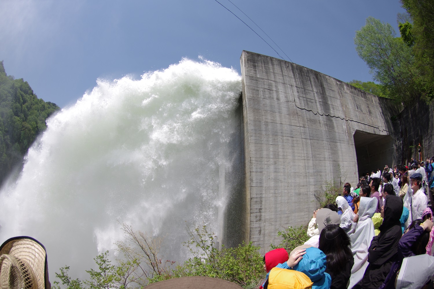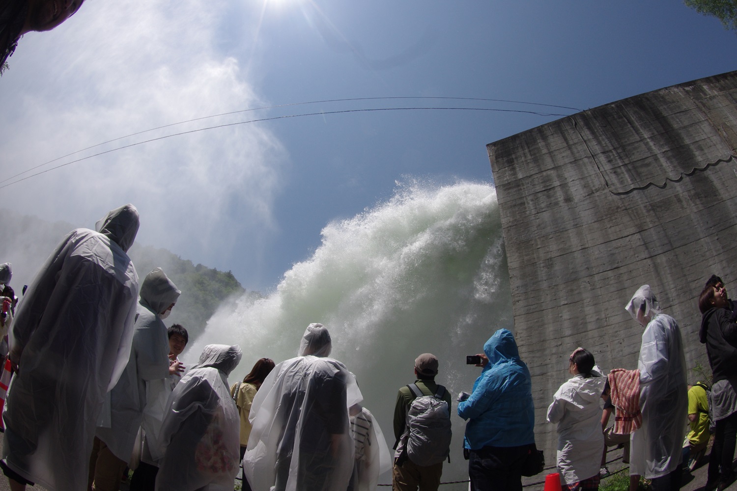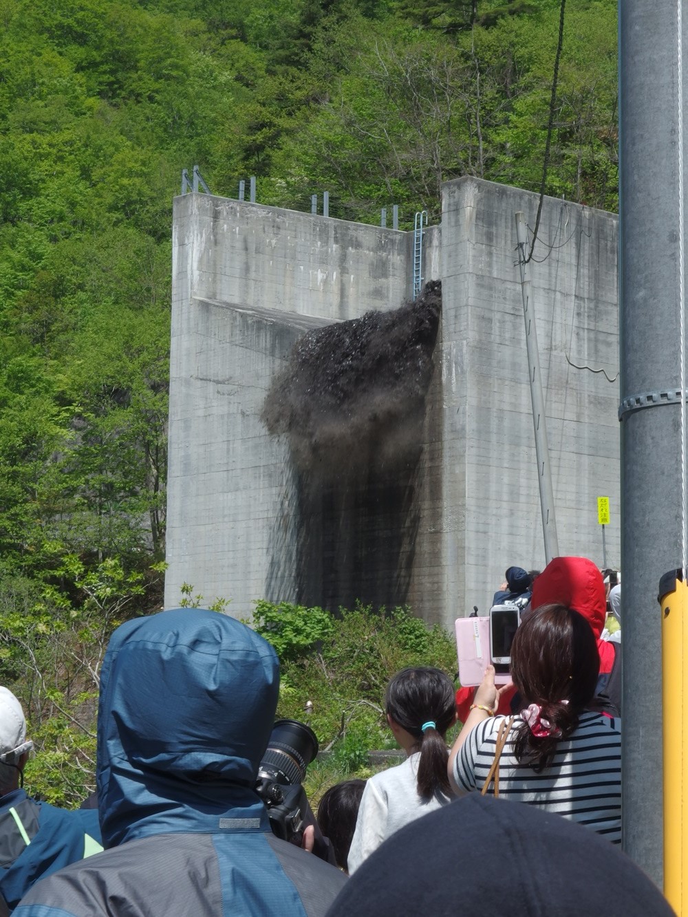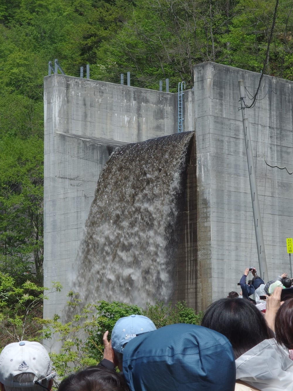 矢木沢から奈良俣に移動中、須田貝ダムの放流を見学