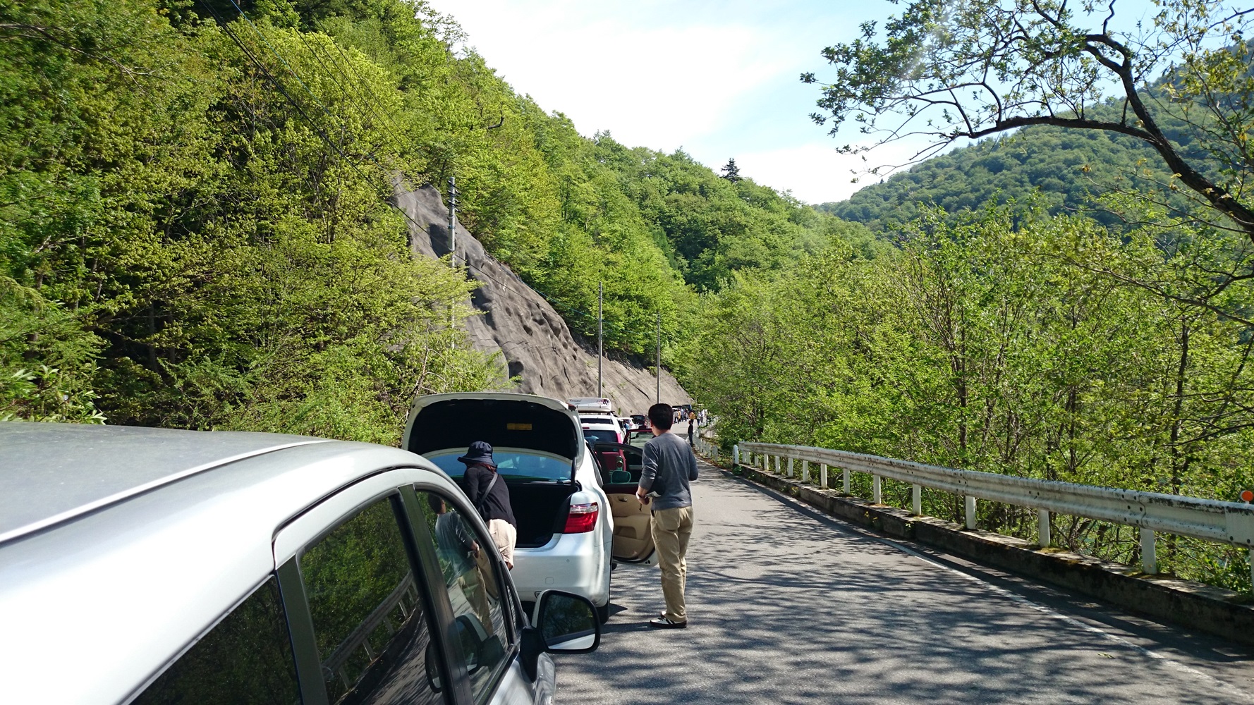 洪水吐の下流の橋から1.5kmくらいの地点まで既に車列